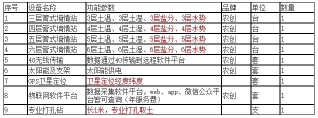 注:可定制測(cè)試深度、測(cè)試層數(shù)、土層間隔、標(biāo)配土壤參數(shù):溫度、濕度、可選參數(shù):鹽分、電導(dǎo)率、土壤水勢(shì)、土壤成分(供參考)氮、磷、鉀、銨態(tài)氮、硝態(tài)氮。