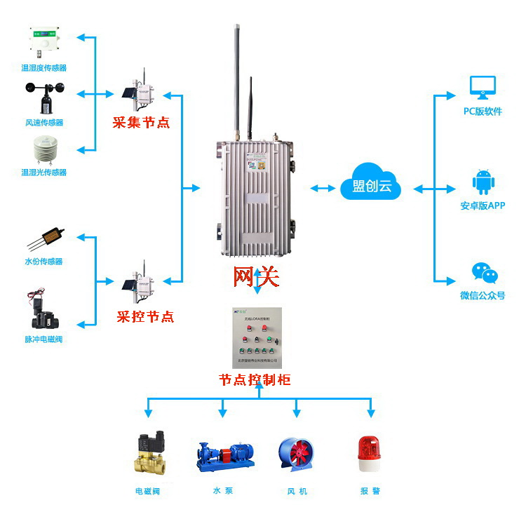 MC-LORA型物聯(lián)網(wǎng)數(shù)據(jù)采集和智能控制一體化系統(tǒng),由MC-LORA型智能網(wǎng)關(guān)、MC-LORA型無線節(jié)點(diǎn)采集/控制器、智能控制柜、物聯(lián)網(wǎng)數(shù)據(jù)應(yīng)用平臺(tái)組成。