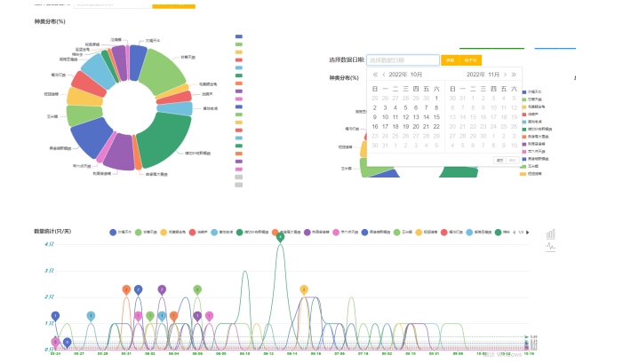 5、蟲害統(tǒng)計(jì)功能。針對(duì)不同品種害蟲識(shí)別結(jié)果歷史數(shù)據(jù),可選擇一定時(shí)間范圍內(nèi)數(shù)據(jù)查詢統(tǒng)計(jì),通過圖表形式顯示??蛇x任意害蟲種類,直觀看出發(fā)生的蟲害種類和數(shù)量,從而判斷其危害程度。